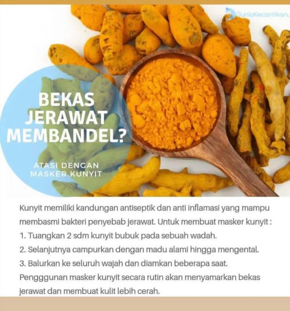 Manfaat kunyit untuk wajah juga berguna untuk mengobati jerawat sekaligus mengatasi bekasnya karena mengandung antiseptik dan antiinflamasi. Kunyit dapat membantu mengatasi jerawat karena beberapa penelitian menunjukkan bahwa kandungan kurkumin dalam kunyit mampu membunuh bakteri . Untuk mengatasi jerawat, kamu bisa menggunakan bahan alami, salah satunya menggunakan kunyit sebagai masker. Tak karang luka jerawat ini mengakibatkan peradangan. Sifat antiperadangan yang terdapat pada kunyit bisa membantu kulit yang meradang .